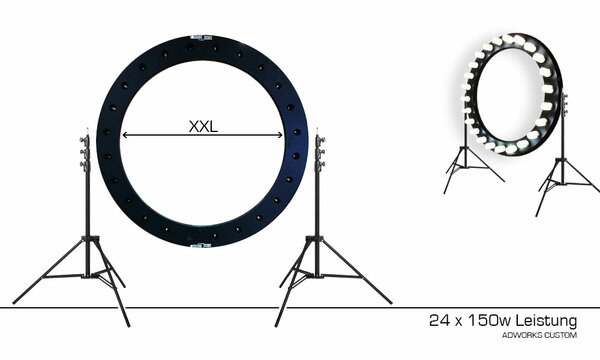 Das runde Ringlicht ermöglicht eine gleichmäßige Ausleuchtung von Gesichtern und Gegenständen und ist damit optimal für Interviews und Musikvideos geeignet. Mit der als Dauerlicht eingesetzten Leistung von 3600w (dimm bar) sind Portraits mit weit geöffneter Blende, Makroaufnahmen und sachliche Produktaufnahmen umsetzbar. Durch den Lichtabfall nach hinten erzeugt das Ringlicht eine außergewöhnliche Plastizität. Die charakteristisch prägnanten Augenreflexe, viel Bildtiefe und die weiche Anmutung machen das Licht zu einem Highlight.